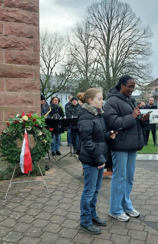 Auch in Kaiserslautern fand eine Gedenkveranstaltung auf dem Synagogenplatz statt, an der Schüler des BurgGymnasiums teilnahmen. Die durch die Stadt Kaiserslautern organisierte Veranstaltung bei der ca. 200 Personen dabei waren, begann um 11 Uhr mit einem Grußwort der Oberbürgermeisterin Frau Kimmel. Gleich im Anschluss daran folgte ein Beitrag der Schülergruppe des BurgGymnasiums. Die 10. – und 12.- Klässler hatten sich im Vorfeld im bilingualen Geschichtsunterricht bei Frau Schmid mit dem Thema beschäftigt und vorbereitet. Bethi Hauck und Greta Schuff lasen das Gedicht „Chor der Geretteten“ der jüdischen Schriftstellerin Nelly Sachs. Dann legten alle Schüler Steine nieder, in Anlehnung an den alten jüdischen Brauch, Steine auf Gräber zu legen als Zeichen des Gedenkens. Zum Abschluss wurden eigene Wünsche für die Gegenwart und Zukunft vorgelesen, die mit folgendem Zitat der Holocaust-Überlebenden Margot Friedländer beendet wurden: „Ich verstehe nicht sehr viel von Politik. Aber ich sage immer: So hat es damals auch angefangen. Seid vorsichtig. Macht es nicht. Respektiert Menschen, das ist doch das Wesentliche.“