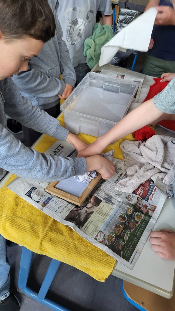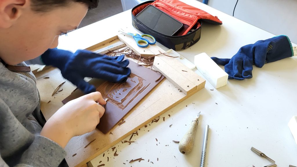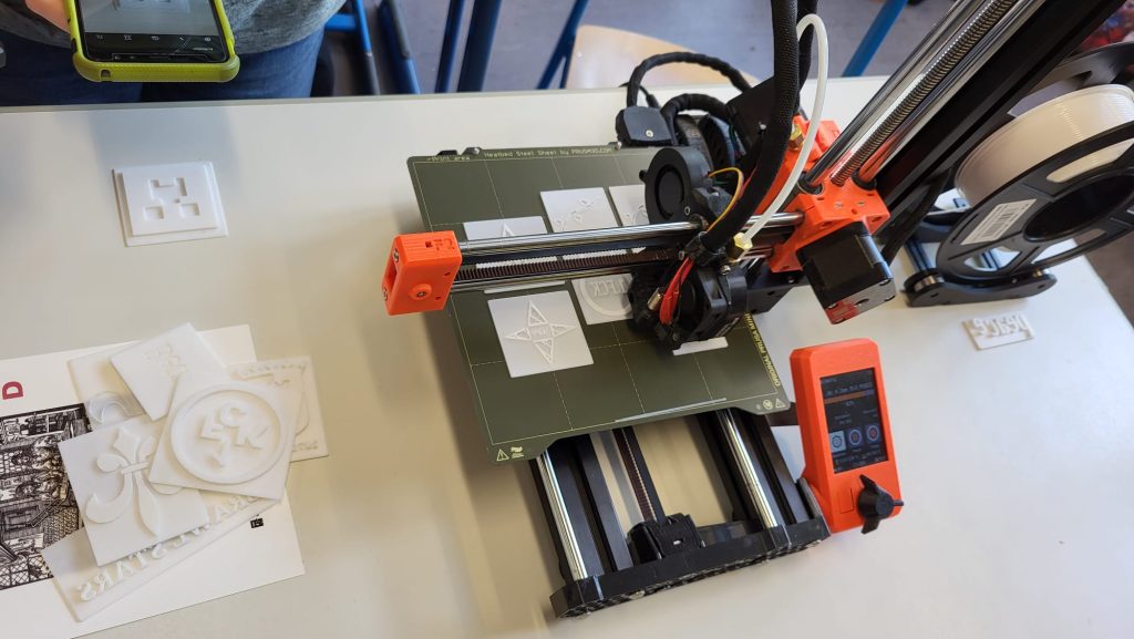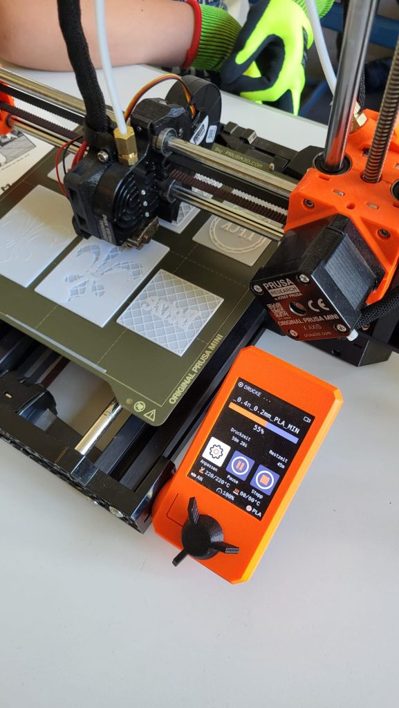Am zweiten und dritten Tag wurden wir selbst zu Druckern – allerdings war nicht das Ziel ein Buch zu drucken, sondern Stempel mit einem selbstgewählten Motiv herzustellen – entweder ganz klassisch aus Linol oder Stempelgummi geschnitzt oder am Computer mit einer CAD-Software entworfen und mit unserem 3D-Drucker gedruckt. Die Stempel haben wir dann mit Stempelfarbe bestrichen und den Druck auf ebenfalls selbst hergestelltes Papier übertragen.