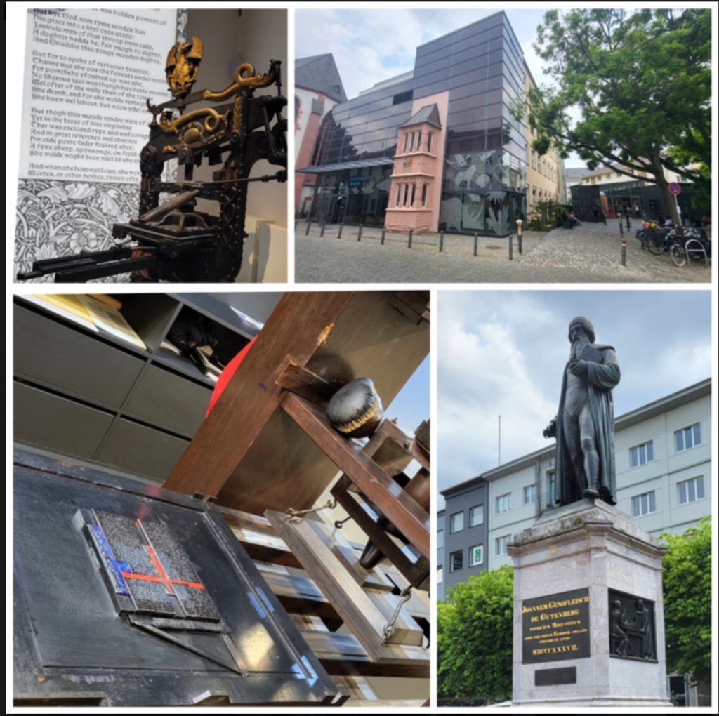 Die Erfindung des Buchdrucks mit beweglichen Lettern, die Johannes Gutenberg um 1450 in Deutschland entwickelte, gilt als eine der wichtigsten Errungenschaften der Menschheit. Die UNESCO hat die Gutenberg-Bibel wie auch künstlerische Drucktechniken 2018 zum Immateriellen Kulturerbe erklärt. Im Rahmen unserer Projekttage besuchte die Projektgruppe das Gutenberg-Museum MOVED in Mainz. Bei einer Führung durch das Museum bekamen wir auch eine Buchpresse, wie sie einst Gutenberg nutzte, vorgeführt und erlebten, wie viele Arbeitsschritte allein zum Druck einer einzelnen Seite notwendig waren. Zum Schluss durften wird dann die ausgestellten original Gutenbergbibeln in der Schatzkammer des Museums bestaunen.