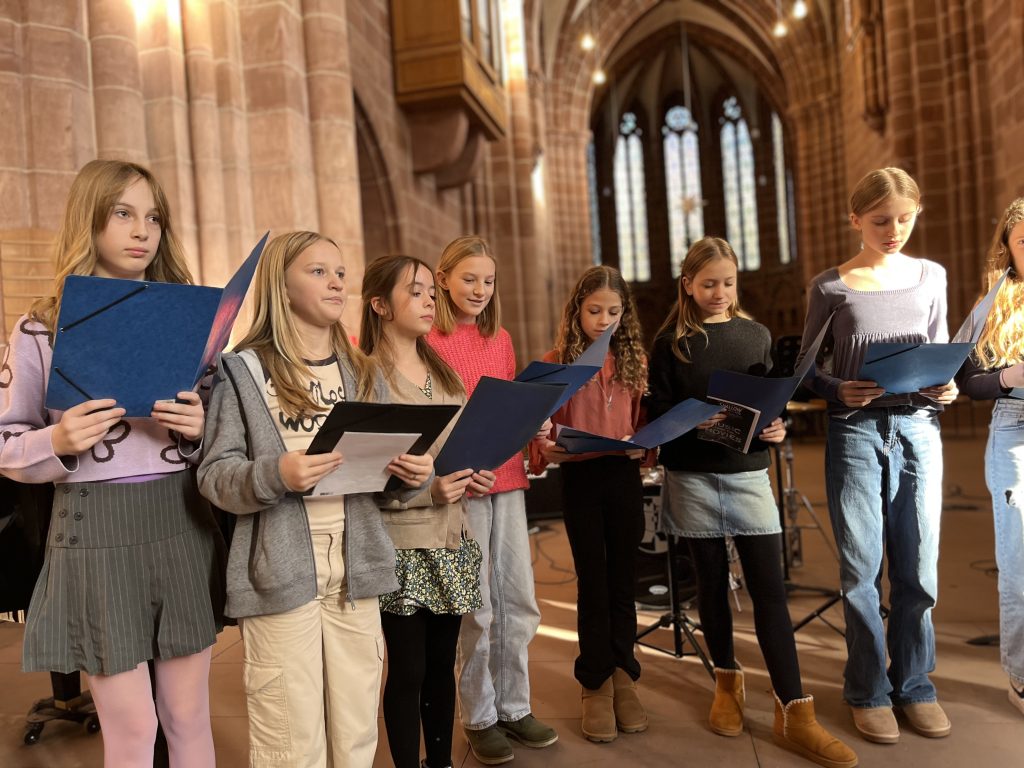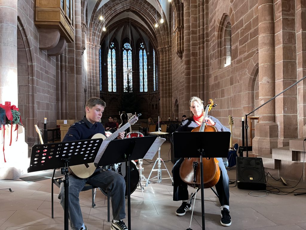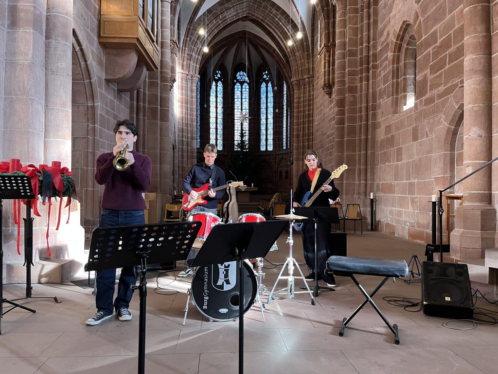 Das Burggymnasium musizierte auch in diesem Jahr bei der Marktmusik Stiftskirche und bot ein buntes Programm. Neben Posaunensolo, Gesang oder Gitarren-Cello-Duo waren auch unsere Ensembles wie der Orientierungsstufenchor, der Lehrerchor oder das Vororchester zu hören. Beeindruckend fanden wir dabei vor allem die zwei selbstkomponierten Stücke von Steven Hesse und Azhin Babakhani, aber auch den Orientierungsstufenchor, der mit Herbstliedern, „The Rhythm of Life“ oder „Shallow“ die Stiftskirche erklingen ließ. Die Ensembles werden geleitet von Ninette Mayer und Lothar Bendel.