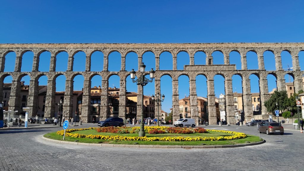 Die Altstadt von Segovia mit ihrer gotischen Kathedrale und der Burg Alcazar liegt auf einer felsigen Anhöhe. Das Wahrzeichen der Stadt ist der römische Aquädukt, über den sie mit Wasser aus der nahen Sierra de Guadarrama versorgt wurde. 1985 wurde Segovia von der UNESCO zum Welterbe erklärt.